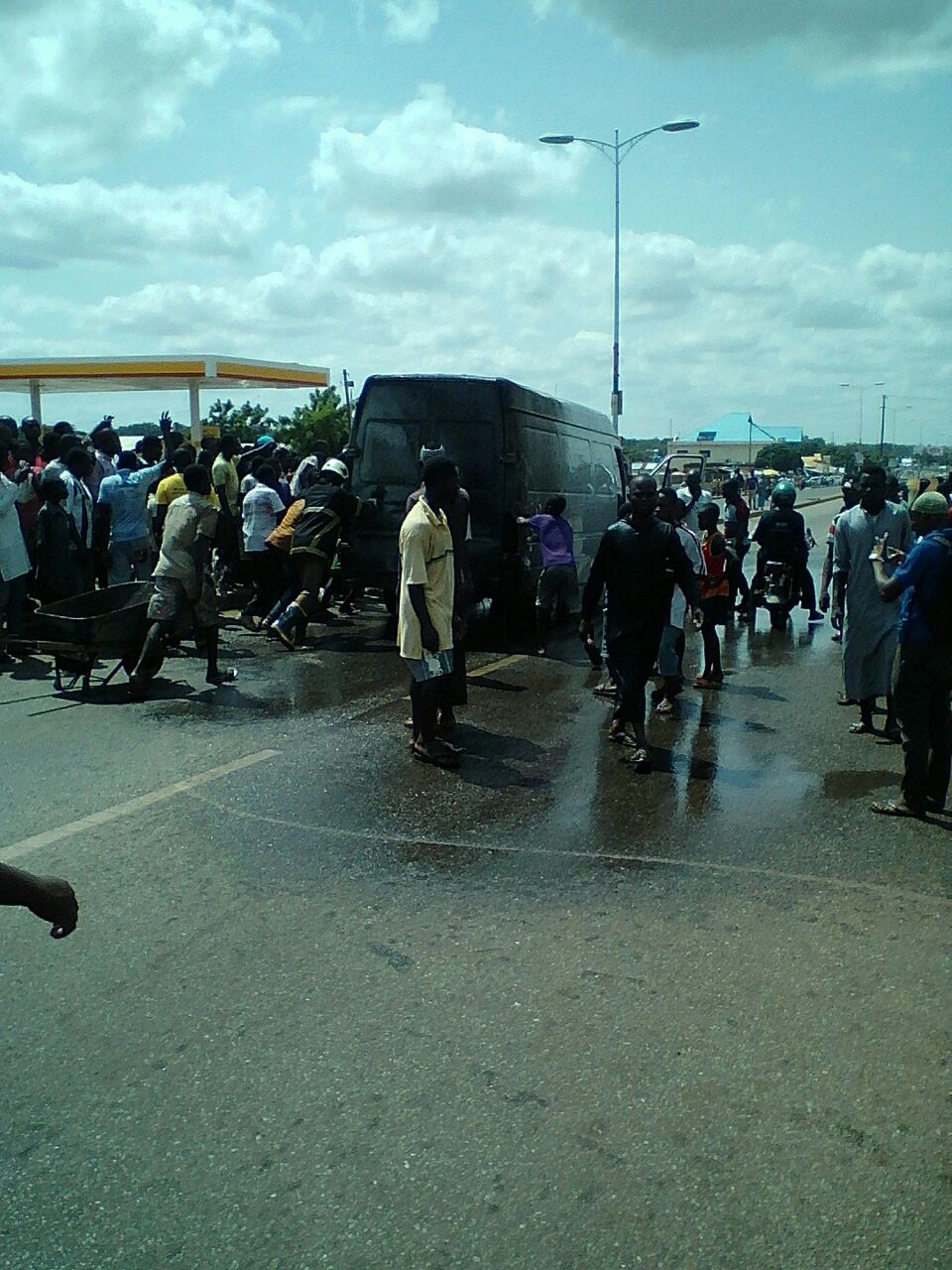 A Mercedes Benz bus with registration number AS 7597-13 carrying passengers this afternoon caught fire at the Sakasaka Shell filling station in Tamale. No casualties have so far been recorded. According to an eye witness, a generator was started close to the underground tank where fuel is offloaded. He said the generator sent some sparks towards the offload bay which caught fire and spread to the said vehicle.